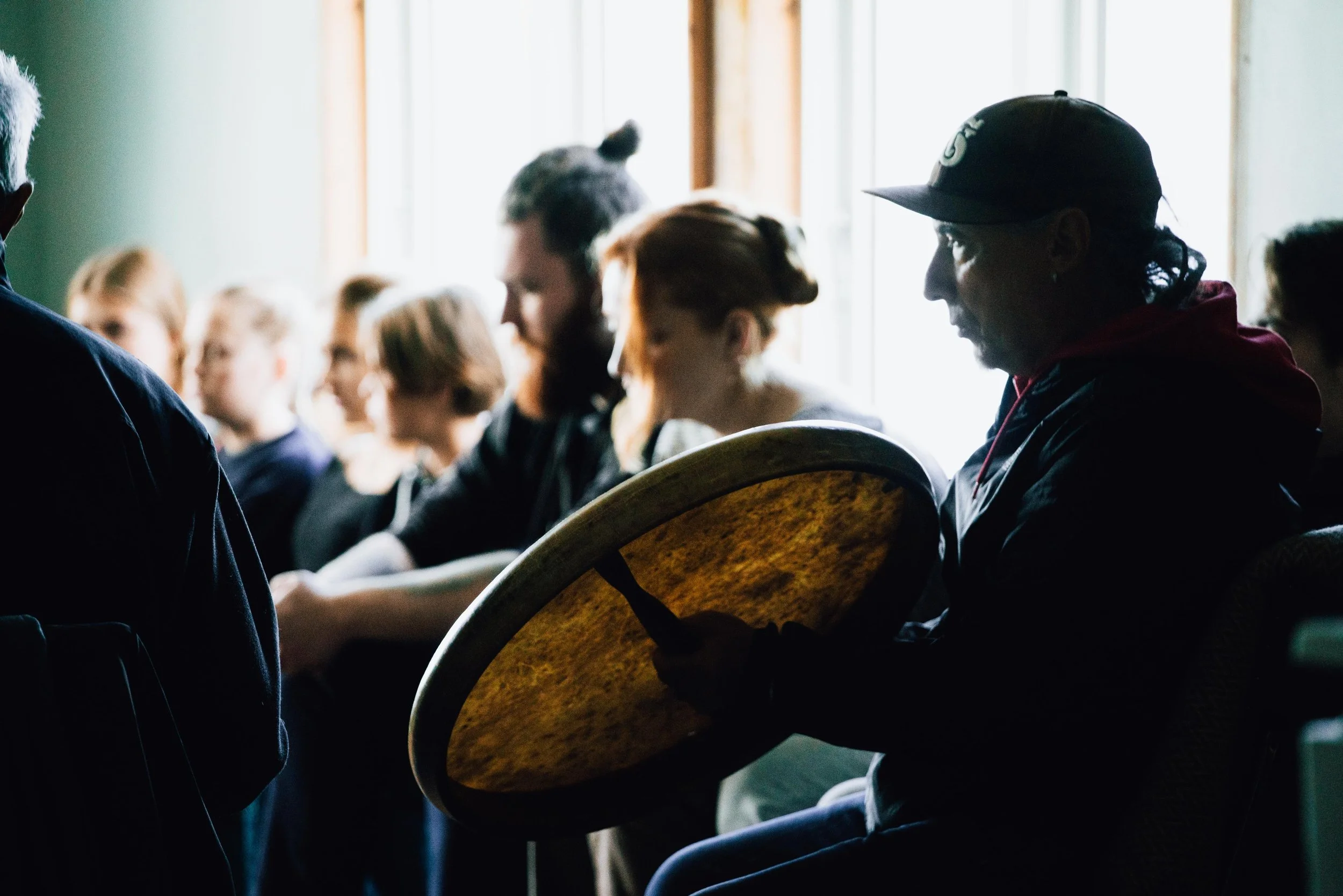 Til verkstedet hadde vi invitert joiker og musiker Torgeir Vassvik, som hjalp oss med å utvikle lydbildet til Kjelvikspillet 2026, med utgangspunkt i samisk kultur og tenkemåte. I tillegg bidro fløytist og imrovisatør Livia Schweizer gjennom å eksperimentere med lydlandskaper i gruppe.